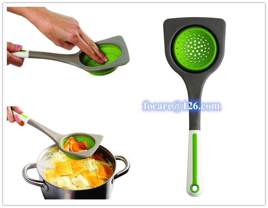 The two component collapsible scoop colander molding process is relatively simple, PP material is injected into a mold in order to make the initial piece of the scoop colander, followed by a second injection of silicone material that is compatible with the initial injection molded piece. Then one collapsible scoop colander with two different material is ejected from two component injection mold after cooling.
